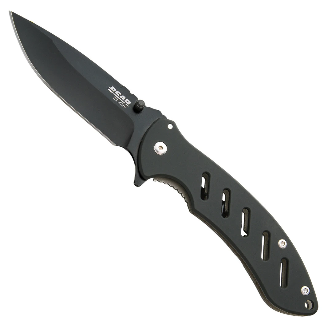 This Bear Edge Brisk 1.0 frame lock flipper knife features a classic drop point blade with a black finish.