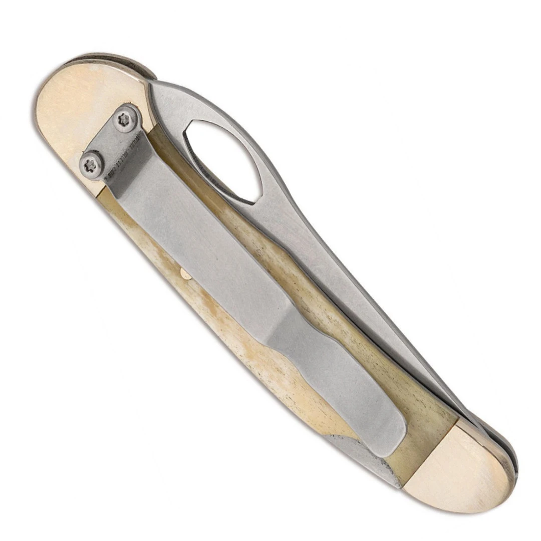 This White Smooth Bone Lockback Folder is a one-handed traditional folder knife. This beautiful knife comes with a pocket clip to make for easier EDC. If you’re a fan of the traditional pocket knife style, you’re sure to love this one! The 440 Stainless Steel prevents rust and holds its edge like charm. It’s perfect for your next outdoor excursion or a project at home.Â