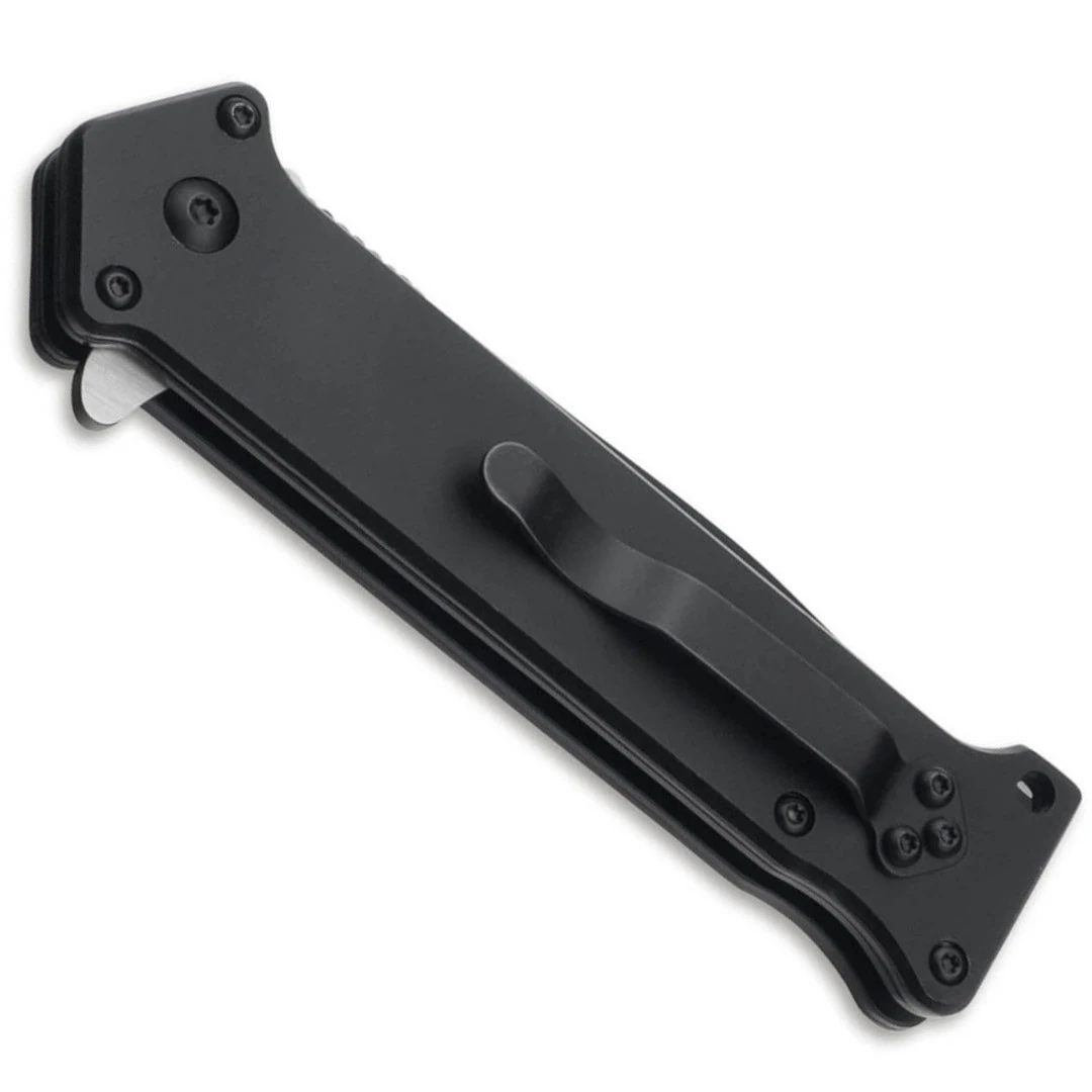 This knife features a black pocket clip for tip up, right side carry only.Â