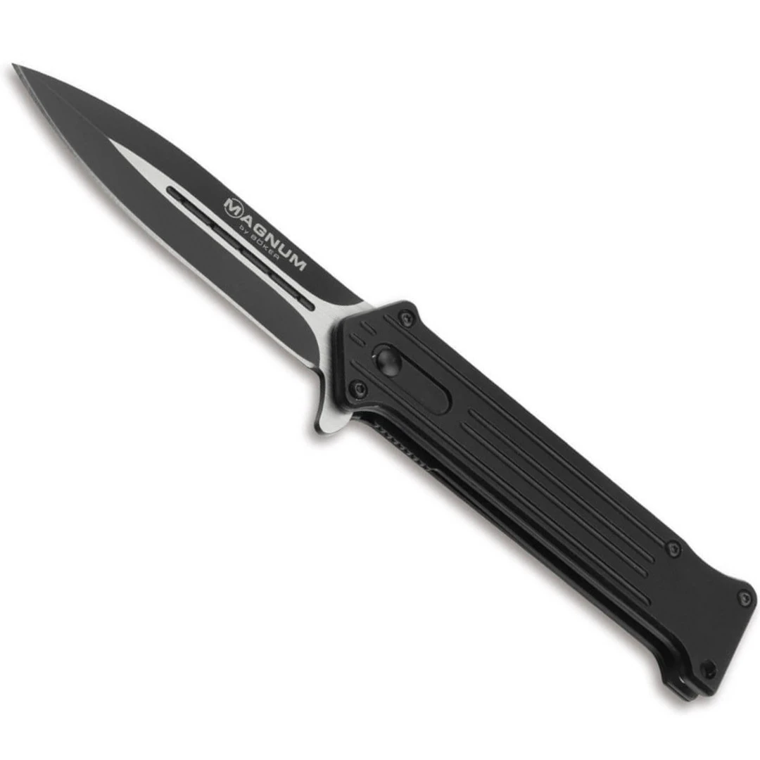 Boker Magnum Intricate Compact Folder Knife is a reliable utility knife. The single-edged, spearpoint blade of this knife is made of tough 440A stainless steel which sports a striking two-tone finish. The handle of this knife is made of black aluminum over black steel liners, giving this knife an intimidating yet classy aesthetic. This tough knife is a great addition to any collection.Â