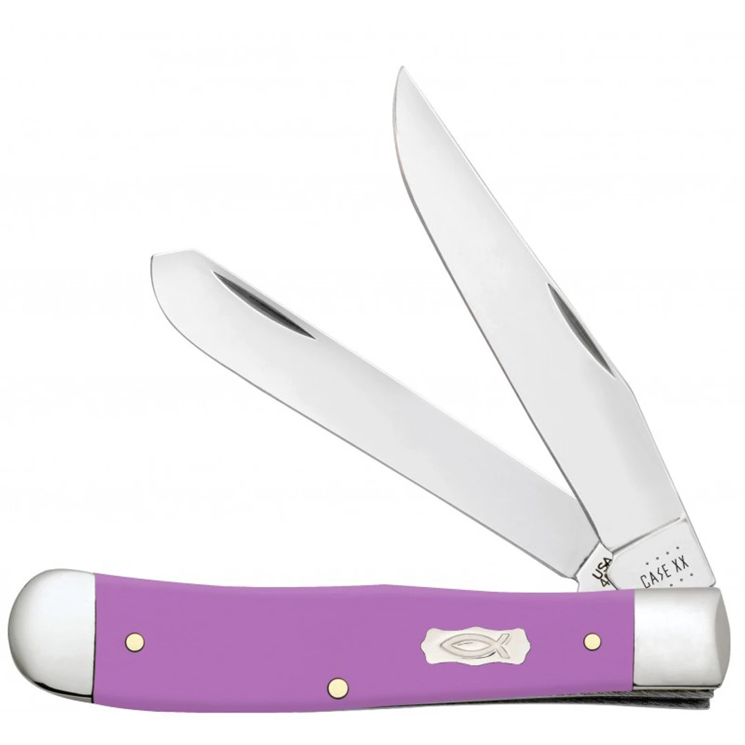 The Case Lilac Synthetic Smooth Trapper features two tough blades. The clip blade is extremely versatile, with a sharp point for piercing and a shape that allows for better control over the cutting edge. The spey blade is an all-purpose knife that is perfect for indoor and outdoor chores. Lilac represents the rarity of the color purple in nature, and the fish is a historic Christian symbol. Paired together, they form an inspirational knife for doing inspired work.Â