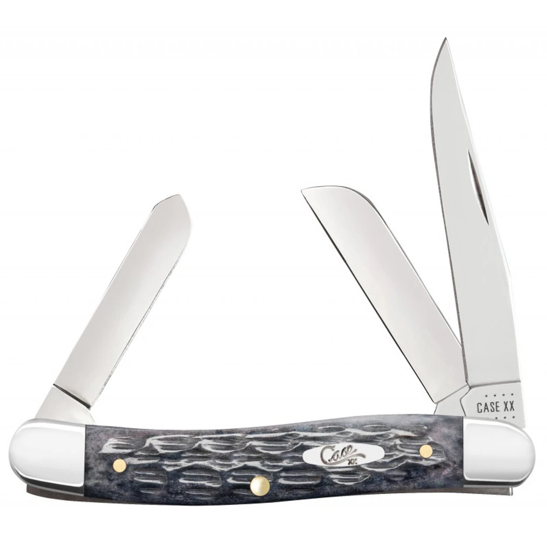 The Case Pocket Worn Gray Bone Crandall Jig Medium Stockman knife features three tough blades. The clip blade is extremely versatile, with a sharp point for piercing and a shape that allows for better control over the cutting edge. This blade provides great cutting abilities for all kinds of chores. The sheep foot blade is designed to provide excellent control and is great for carving and carpentry work. The pen blade is great for light-duty work.Â