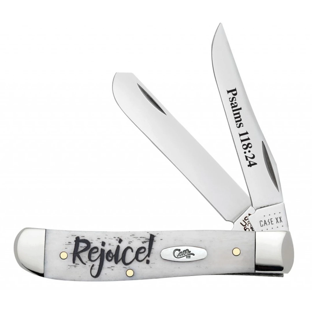 The Case Religious Sayings Natural Bone Smooth Mini Trapper Knife features a clip and spey blade. The knife measures 3.5″ when closed and proclaims “Rejoice!”