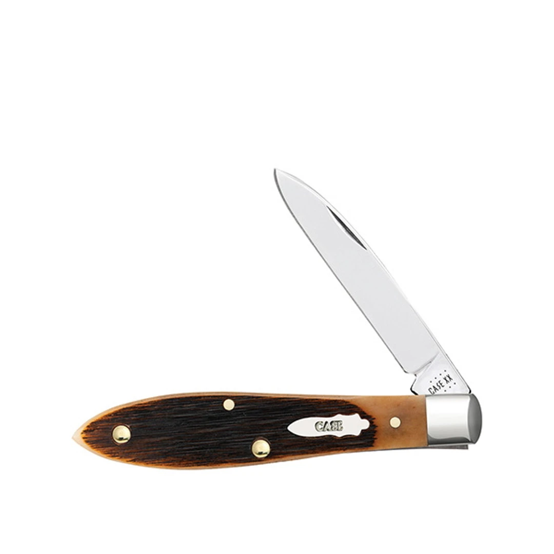 Case Tony Bose Amber Bone Sawcut Jig Barehead Tear Drop Knife knife features one tough blade. The spear blade is a symmetrical shape that makes it ideal for piercing. This is a heavy duty blade that is great for tough chores. Paired with the beautiful amber bone of the handle, this knife is a stunner.Â