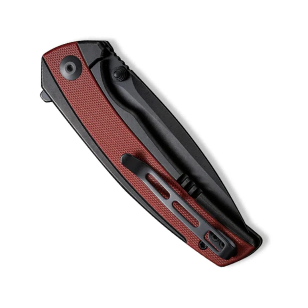 The CIVIVI Teraxe is a mid-sized flipper and boasts the perfect combination of aggressive and ergonomic, tough and functional. This knife features a drop point blade made of Nitro-V steel in a sleek black stonewash finish. The style of the blade provides plenty of belly for nice slicing action while the steel of the blade provides a sharp edge and good corrosion resistance. This excellent blade is paired with a handle made of durable black stainless steel with an attractive inlay of burgundy G10 which provides good looks and a good grip. The CIVIVI Teraxe is a fantastic everyday carry.Â