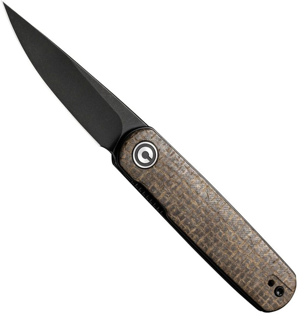 The CIVIVI Lumi Liner Lock knife has a black stonewash drop point blade made with 14C28N steel. The ball bearing pivot makes for smooth and easy opening, as well as a liner lock you can have confidence in. The brown burlap micarta scales and stainless steel liners provide a weight that is great for your EDC.Â