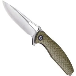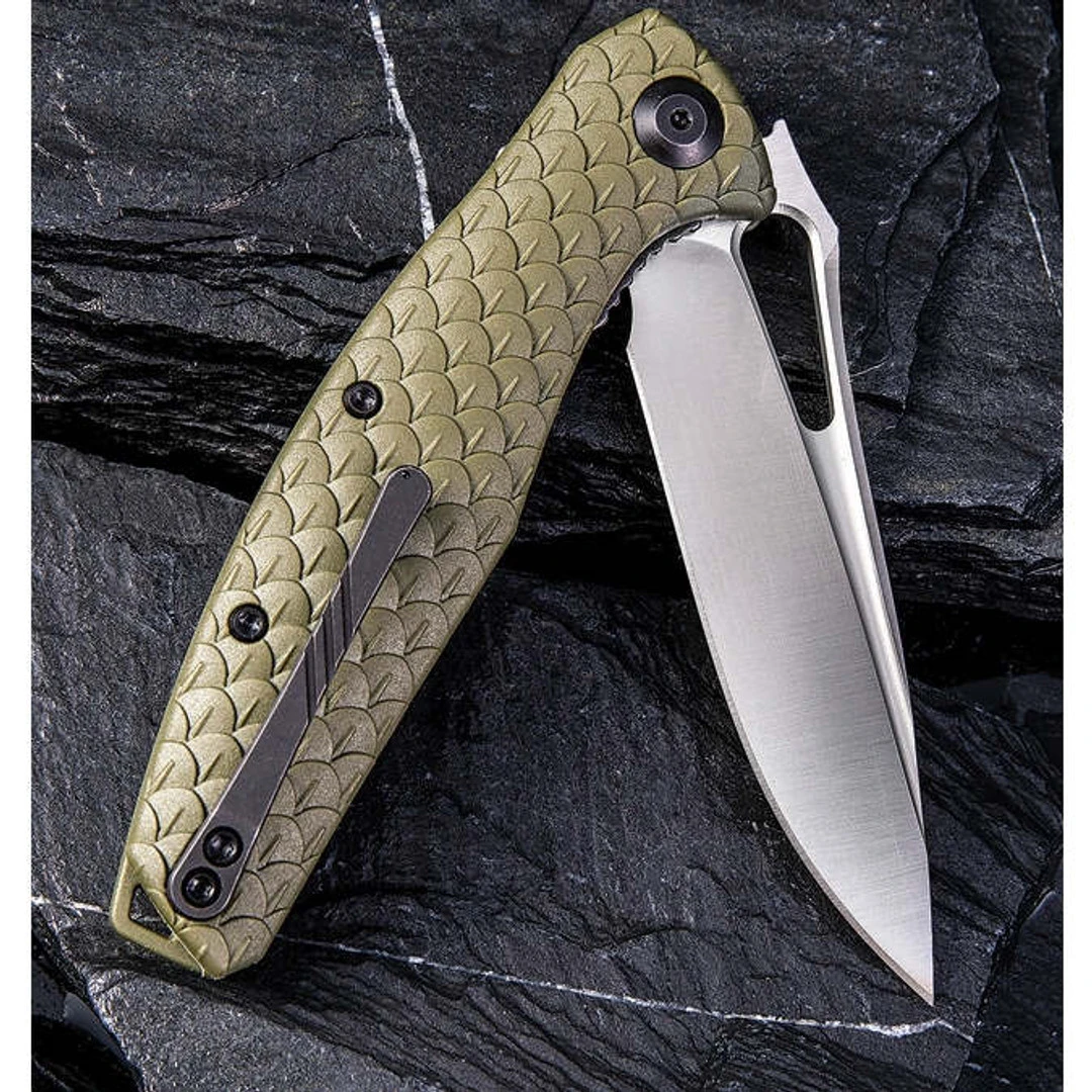 The CIVIVI Wyvern boasts smooth and easy flipper action. The satin finished D2 blade glides open on a fantastic caged steel ball bearing. The Green FRN (fiberglass reinforced nylon) handle is lightweight yet tough-as-nails and delivers a secure grip with the visually intriguing pattern. The titanium clip is tip up.