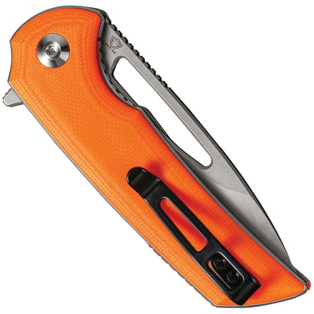The CIVIVI Odium is a stout flipper with a stonewash finished D2 drop point blade. The flat ground blade snaps open smooth and easy on the caged ceramic ball bearing system. The broad blade delivers excellent slicing capability and is ideal for a heavy use daily carry. This model features orange G-10 handle scales and a left/right reversible tip-up deep-carry pocket clip for discreet carry.