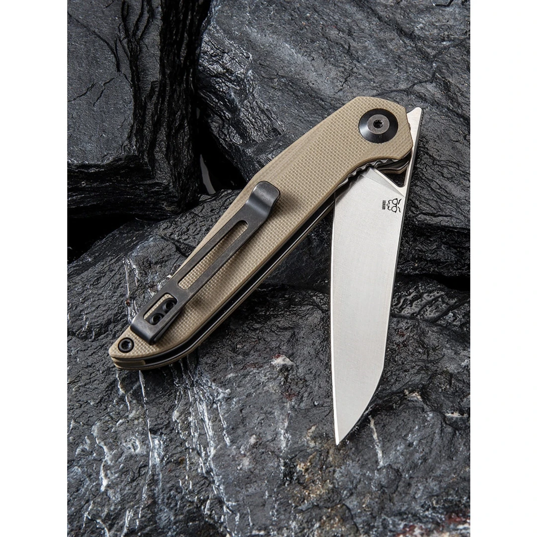 The CIVIVI McKenna boasts tan G-10 handle scales and smooth flipper action. This Elijah Isham design features a full flat ground D2 blade with a satin finish. This classic flipper is ideal for upscale carry and everyday use. L/R reversible deep carry tip-up pocket clip.