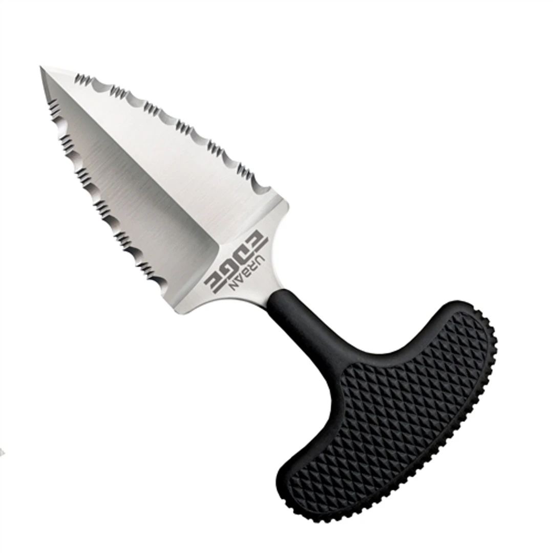 The Cold Steel Urban Edge features full serrations on both edges of the blade. This well made push knife is a surprisingly versatile and useful everyday tool that allows you to grip it with an open hand and still have full control over the knife. Cut boxes, sign paperwork, even type all without the knife very leaving your hand. Tough Kray-Ex handle is built for heavy duty use.