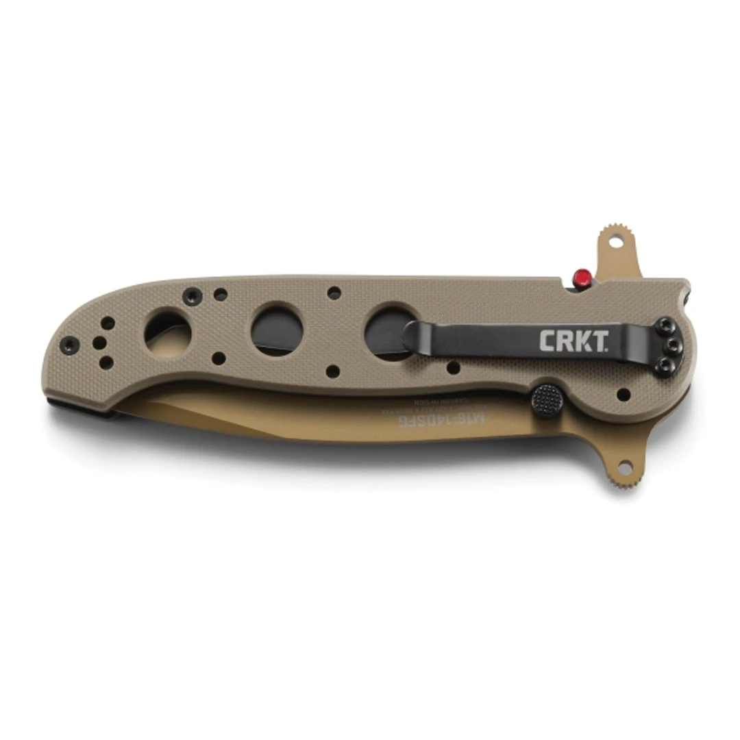 The Special Forces variation of the M16-14 Kit Carson designed knife is a response to all elite operators and military procurement specialists around the globe. Upgrades to this popular model include a dual grind tanto blade in addition to the dual blade guards that ensure safe handling and prevent accidental slippage. Each liner lock designed model features the Carson Flipper that not only deploys the blade but doubles as a blade guard in the open position. Additionally this knife features CRKT’s automated liner safety which is a next-generation locking mechanism that sets a pin between the locking liner and the frame–virtually turning this folder into a fixed blade. This model features desert tan G-10 handle scales, all-black hardware and stainless steel liners, a partially serrated tanto style blade, complete with Veffâ„¢ serrations, in a tan finish and the fully reversible 4-way pocket clip is designed for tip up or tip down carry on either side of the handle.