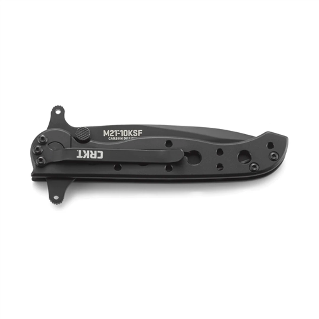 The M21™ series is one of CRKT’s most popular tactical folders that they sell and this particular model offers the same rugged platform in a more EDC-friendly make-up. Designed by American knifemaker Kit Carson, who created the the M16™ and the M21™, each frame lock designed model features dual Carson Flippers, in addition to dual thumb studs, for quick and convenient blade deployment which also act as blade guards for added security on top of sporting CRKT’s patented Triple Point™ serrations to help reduce drag through materials. From the beginning, CRKT has been driven by a single purpose: to bring useful technological advancements and entirely new product concepts to today’s market. This model, the M21-10KSF, features a black semi-skeletonized stainless steel handle, a party serrated spear point style blade in a black finish and the reversible pocket clip is designed for tip down carry only but is eligible for a left or right hand carry option.