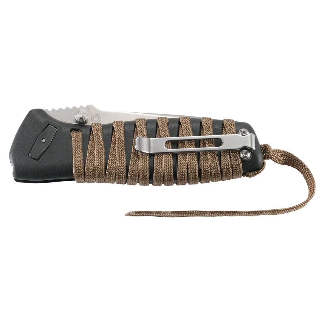 This folder model features black GRN handle scales with coyote brown paracord wrapping, a drop point style blade in a satin finish and the reversible pocket clip is designed for tip up carry only.