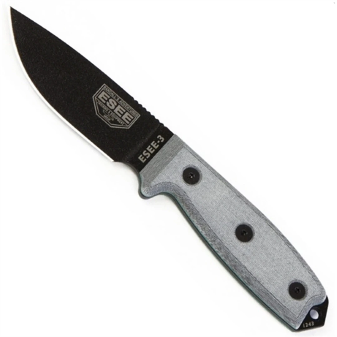 The ESEE-3 fixed blade knife by ESEE Knives, formerly known as RAT Cutlery, was the model that kick-started their acclaimed fixed blade lineup. This knife can also be used as a perfect hunting or camping knife as well as used in a tactical environment. Like most ESEE knives, there are a wide variety of blade styles, colors finishes and accessory options to fit every need. This particular model, the 3P, features a grey linen micarta handle complete with green liners, standard glass breaker pommel, a drop point style blade in a textured black powder coated finish and a coyote brown colored polymer sheath and clip plate for a variety of carry options. Made in the USA.