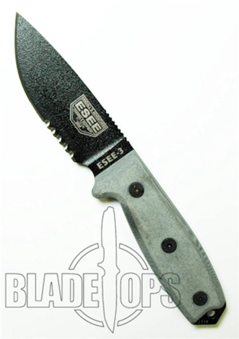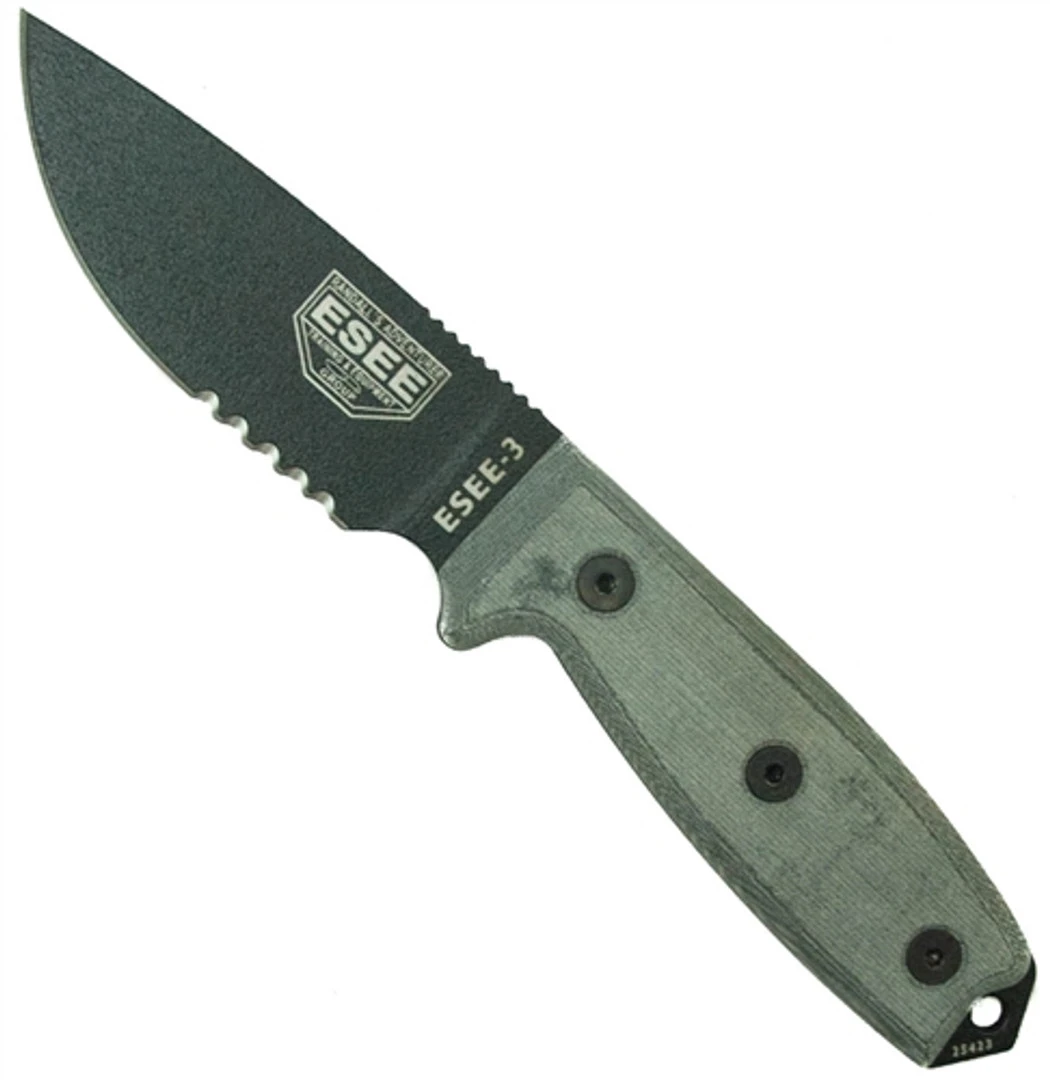 ESEE Knives RC3S Fixed Blade Knife, Black Blade, Part Serrated, Linen Micarta Handle, ESEE-3S