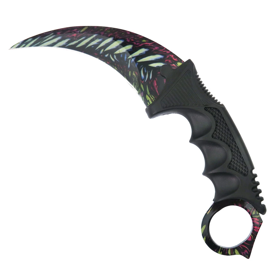The Archimedes Claw Karambit is a beautiful, well constructed knife inspired by a tigers claw. This knife originated in Indonesia back in the 11th century. It was originally used for agricultural purposes such as gathering rice stalks, but eventually transitioned into a weapon used in many wars and as a self defense weapon. The shape of the blade allows for a more powerful and precise cutting stroke which was valuable for both of these different uses. This specific model showcases a dragon tooth design finished blade and finger ring with a black textured handle. It comes in a hard plastic sheath with a lanyard for easy neck carry.