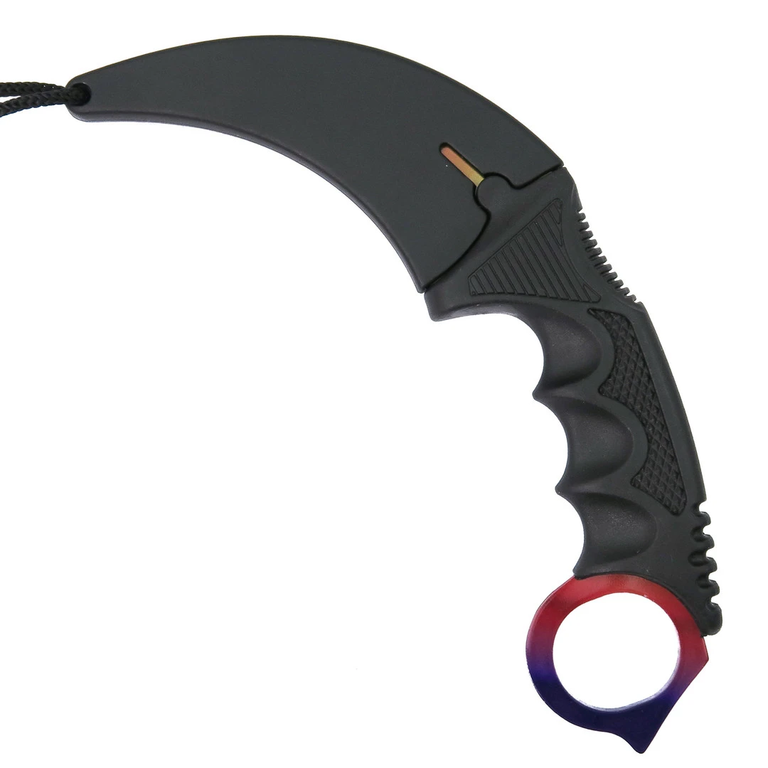 The Archimedes Claw Karambit is a beautiful, well constructed knife inspired by a tigers claw. This knife originated in Indonesia back in the 11th century. It was originally used for agricultural purposes such as gathering rice stalks, but eventually transitioned into a weapon used in many wars and as a self defense weapon. The shape of the blade allows for a more powerful and precise cutting stroke which was valuable for both of these different uses. This specific model showcases a Rainbow finished blade and finger ring with a black textured handle. It comes in a hard plastic sheath with a lanyard for easy neck carry.