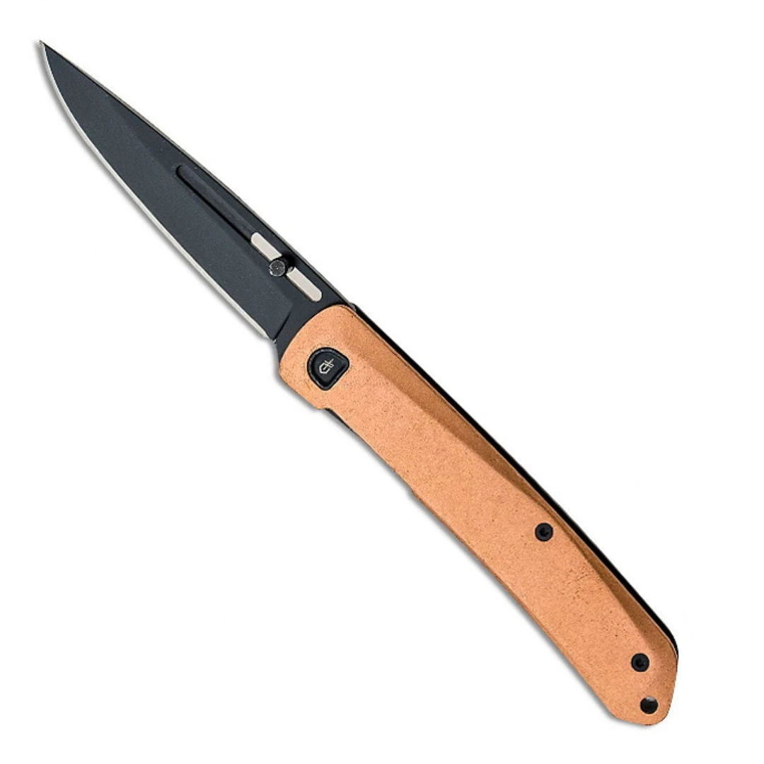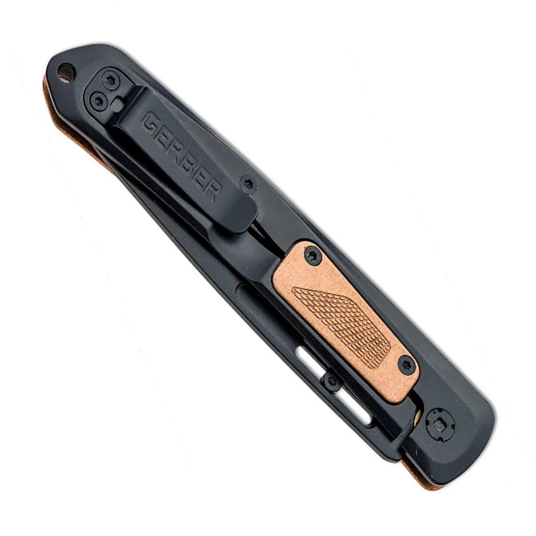 The Gerber Affinity Frame Lock Folder Knife is the definition of a gentleman’s knife. The Affinity was designed to be sleek and classy, with a black stainless steel frame and a copper scale. The thin drop point blade comes with thumb studs and nail nicks to make for easy opening. The thumb stud is adjustable to better fit your hand and opening preferences.Â