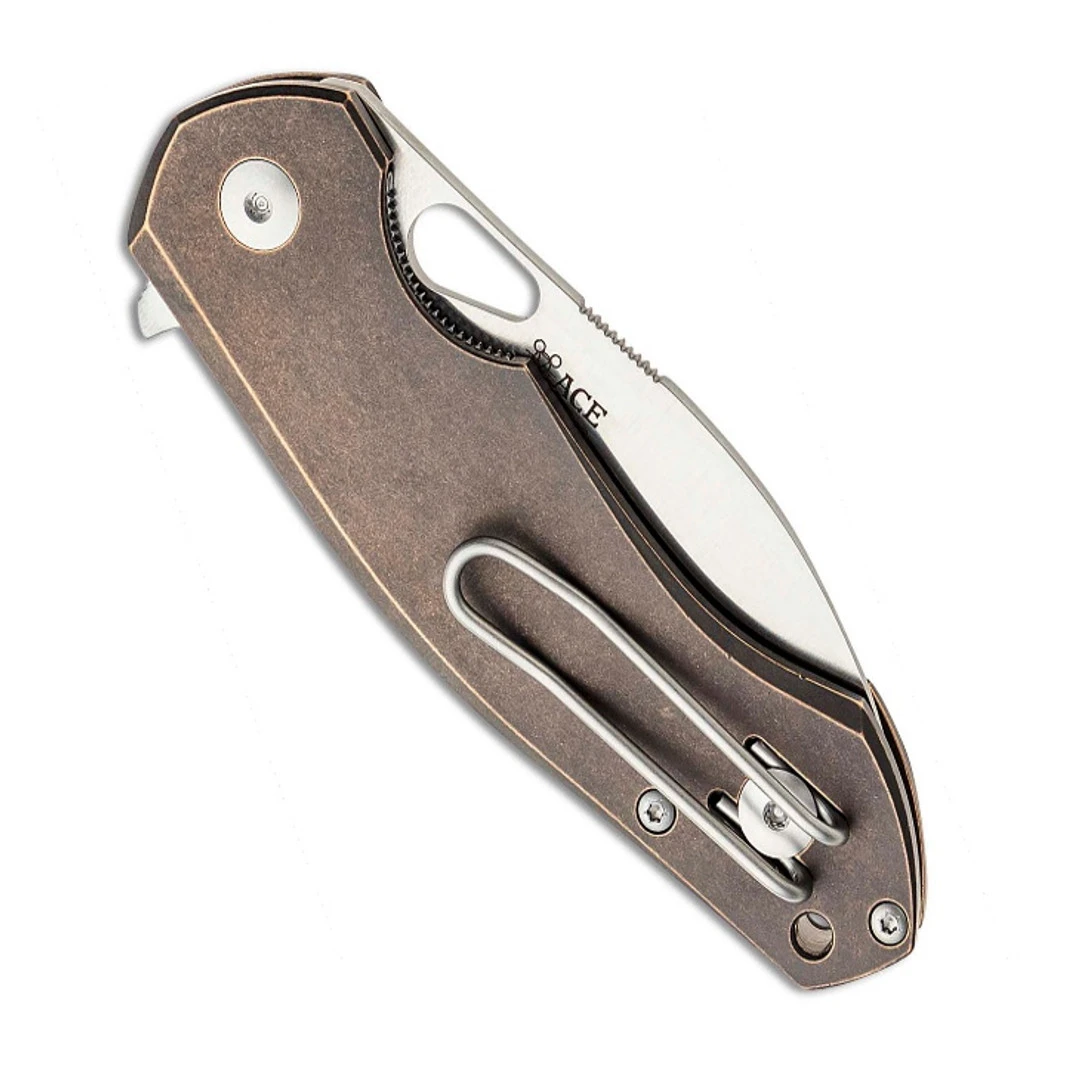 The GiantMouse ACE Biblio Bronze with a Natural Canvas Micarta Inlay Folding Knife is a stout, capable knife that provides solid cutting performance in outdoor and urban environments alike. This knife is made of high quality materials, boasting a sheepsfoot blade made of tough M390 steel and a brass handle with a natural canvas micarta inlay.