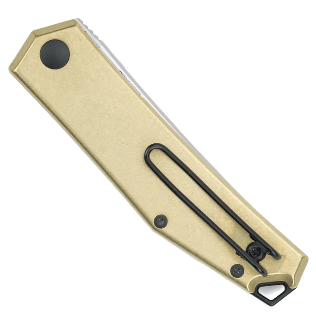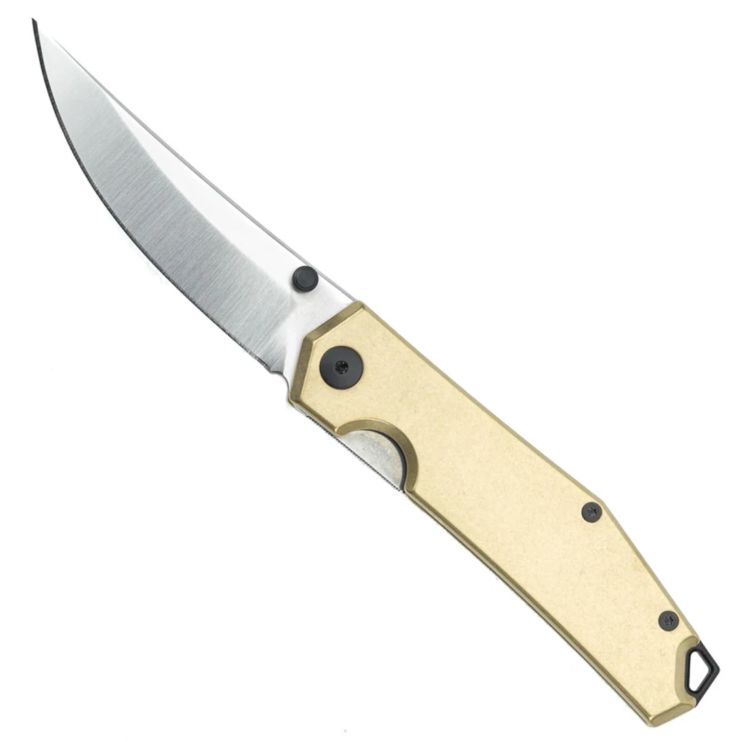 The GiantMouse ACE Clyde Brass Folding knife is a slender knife that packs a punch. This slim folding knife boasts a beautiful, sleek brass handle and M390 stainless steel blade. This knife opens with the thumb tab and locks in place with the liner lock. With an ergonomic design made to fit perfectly in your hand, this powerful knife is a great EDC.Â