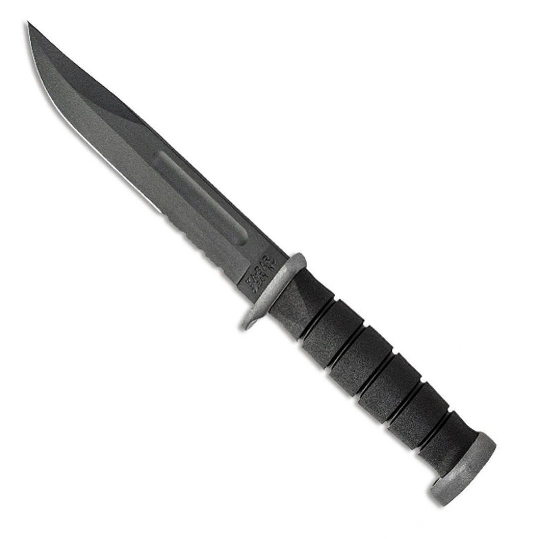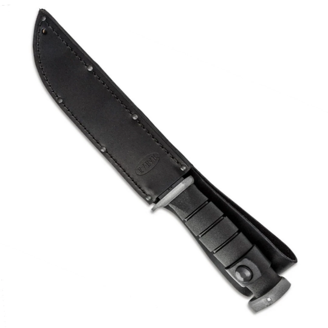 The Ka-Bar D2 Extreme Fighting knife features a black epoxy powder finished D2 blade with a heavy duty combo edge. Known for maximum toughness, the D2 blade delivers power and precision. The Kraton handle delivers a secure grip and is made to weather any elements you encounter. The hand guard and pommel are powdered steel. The knife comes with a rugged leather belt loop sheath.Â