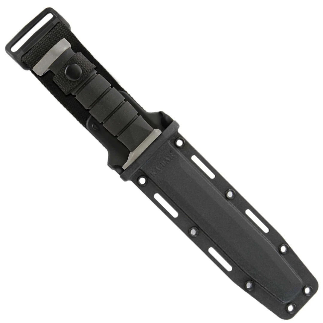 You asked and Ka-Bar delivered. The D2 Extreme knife features a black finished D2 blade with a combo edge. Known for maximum toughness, the D2 blade delivers power and precision. The Kraton G handle delivers a secure grip and is made to weather any elements you encounter. The hand guard and pommel are powdered steel. The knife comes with a rugged MOLLE compatible, glass-filled nylon sheath.Â