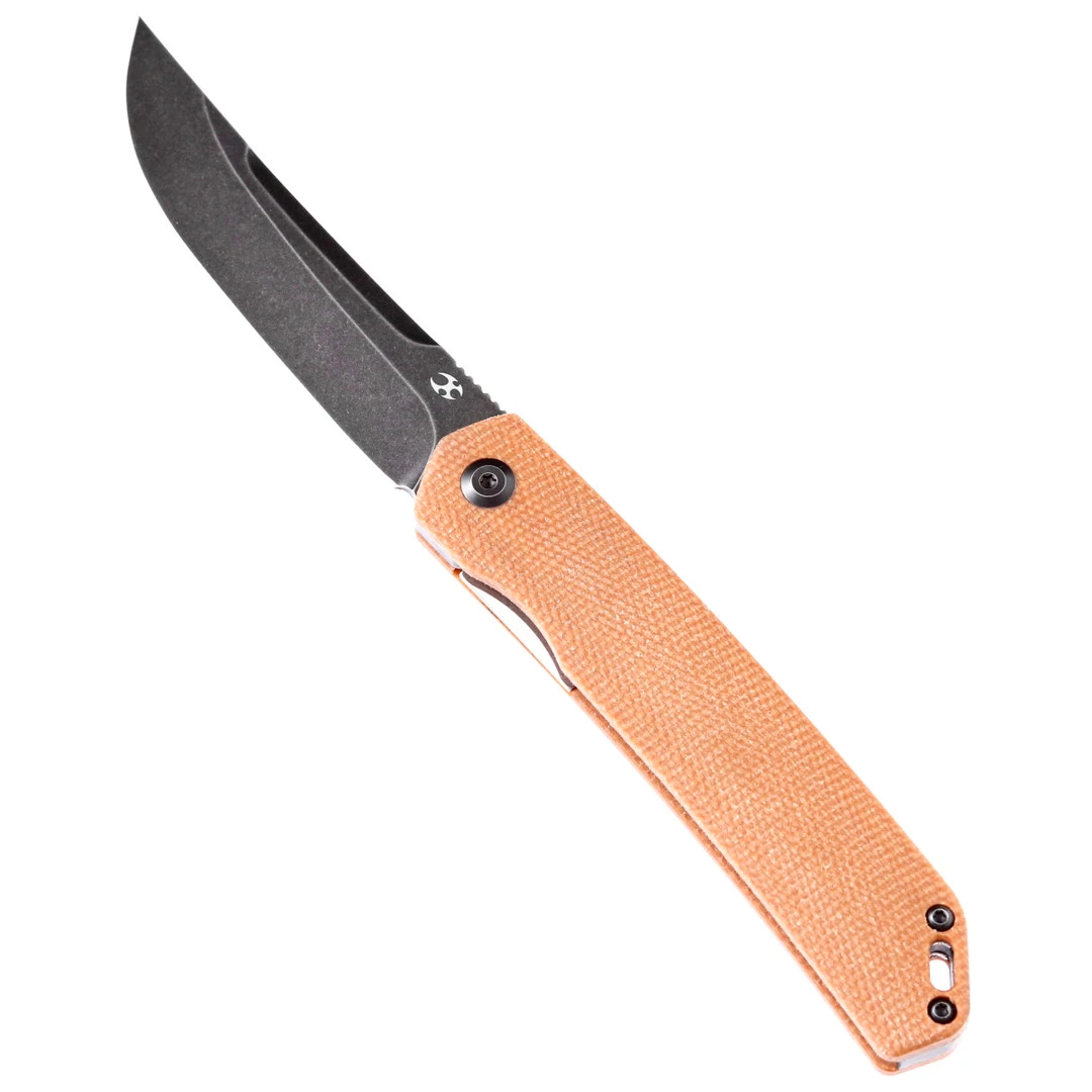 The Kansept Knives Hazakura is designed to be a go anywhere, effective tool. This knife features a drop point blade and brown micarta handle scales.