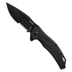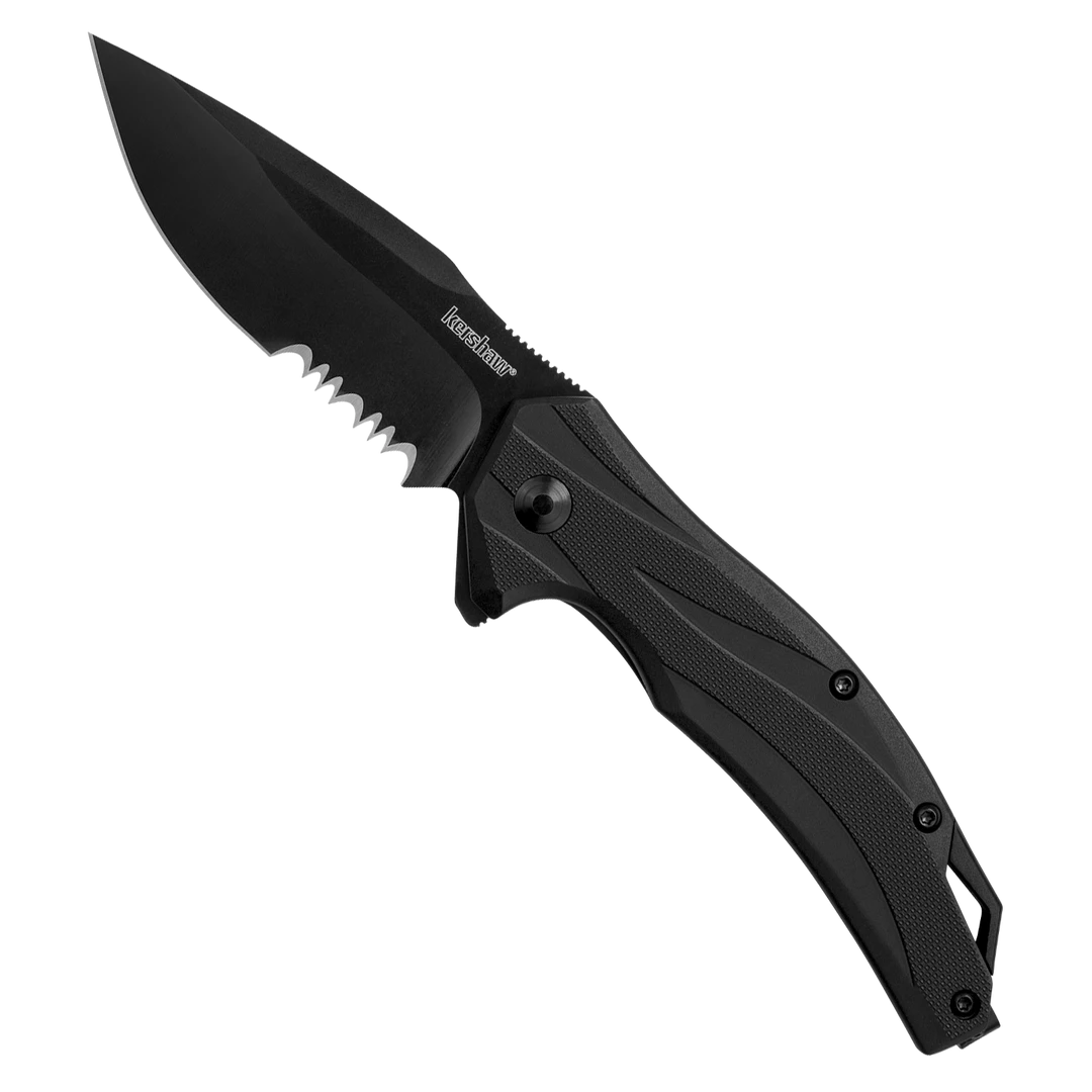The Kershaw Lateral flipper knife features a tough black, tactical construction. With a blade made of tough, easy-to-sharpen 8Cr13MoV stainless steel, this knife will be ready to cut when you need it. The partially serrated blade features a black oxide finish and is paired with a matching black glass-filled nylon handle. The handle is textured for an ergonomic, comfortable grip and the blade snaps open with the SpeedSafe Assist pivot assembly. This reliable, high performance knife is perfect for everyday carry. The Lateral won’t break the bank, either. Get yours today.Â