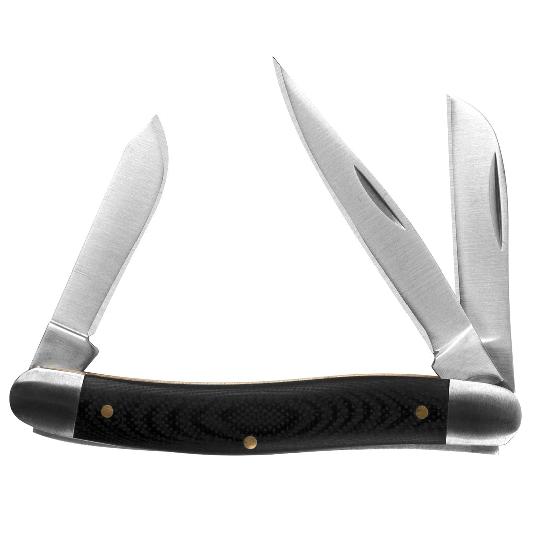 This folder knife features black G-10 handles scales, a clip point, spey and wharncliffe style blades in a satin finish and no pocket clip.