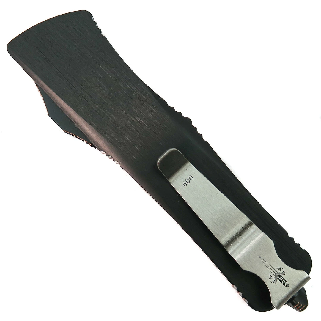 The handle features a satin finish copper top with stippled edges and black anodized aircraft alloy bottom. The hardware is copper ringed, adding that special finish to this custom knife.Â