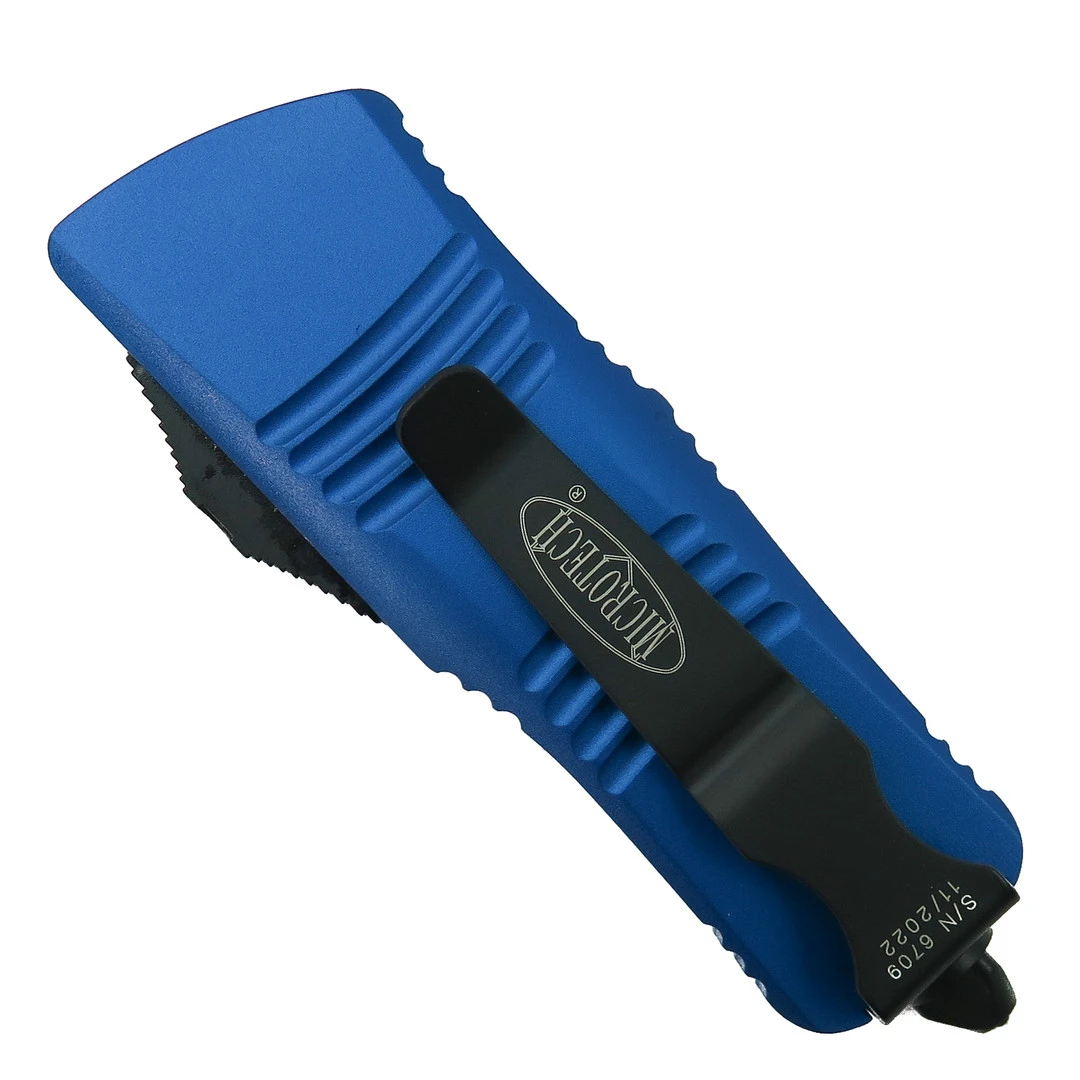 The Microtech Mini Troodon OTF auto knife features a blue anodized aluminum handle along with a black finished tanto blade with a standard edge.
