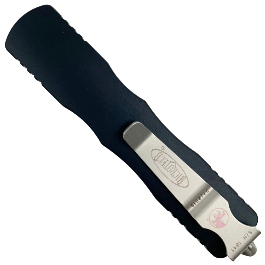 This out-the-front model features a black anodized handle and a dagger style blade, that is fully serrated on one side, in a stonewash finish.