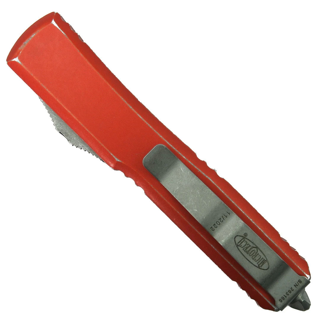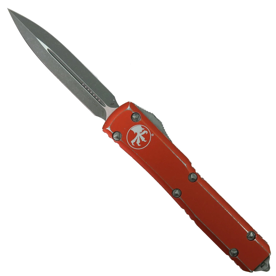 This Microtech Ultratech out-the-front automatic knife features a distressed orange anodized aluminum handle and an apocalyptic stonewash finished dagger blade.