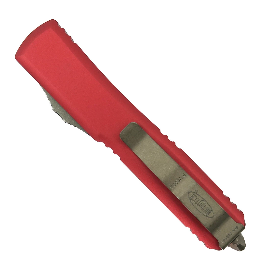 This Microtech Ultratech out the front automatic knife features an apocalyptic bronze finished single edge blade paired up with a red anodized aluminum handle and matching bronzed apocalyptic hardware.Â