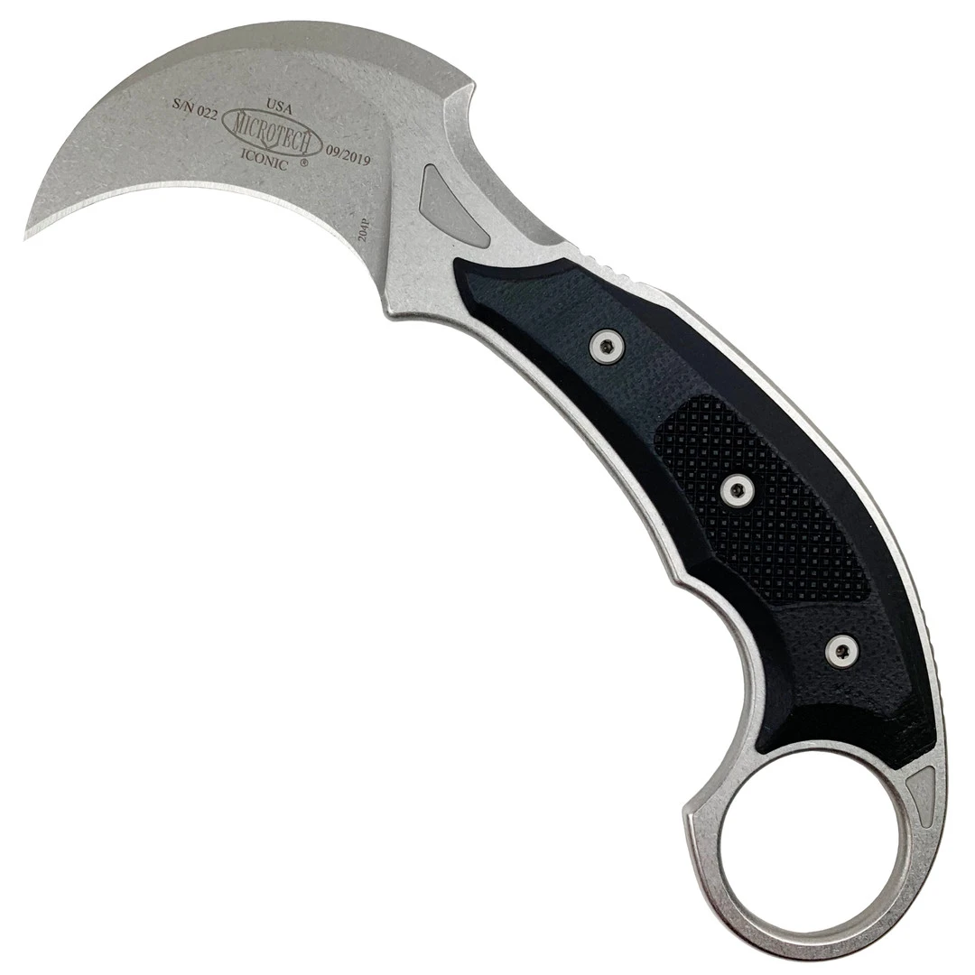 This fixed blade knife features black G-10 overlays atop stainless steel handles, a hawkbill style blade in a stonewash finish and includes a custom kydex sheath which was only designed for right-hand carry.
