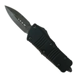This Microtech Signature Series Mini Troodon OTF knife features a Damascus dagger blade with dual standard edges. The handle is black anodized aluminum upper and lower. All the hardware is black.