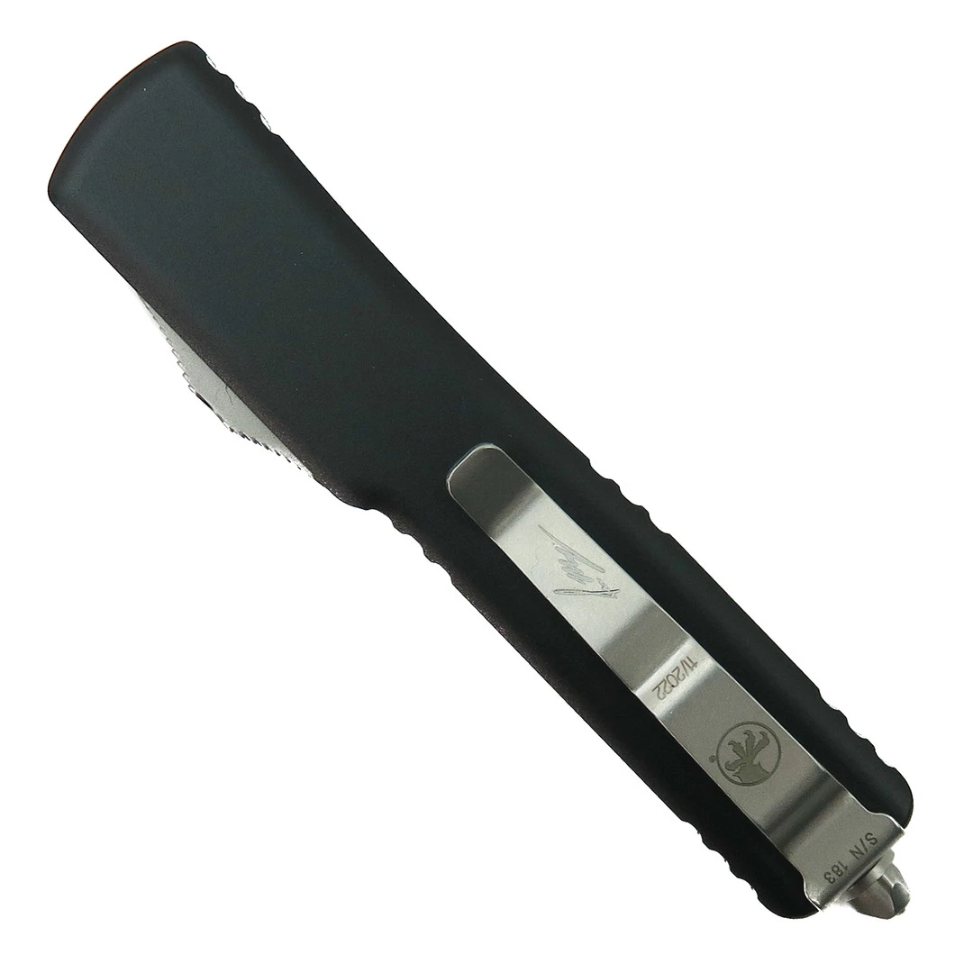 This Microtech Signature Series Warhoud UTX-70 out-the-front knife features a stonewash finished Warhound style blade. The handle is black anodized and the hardware is satin finished.