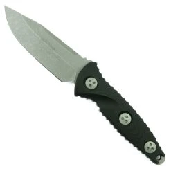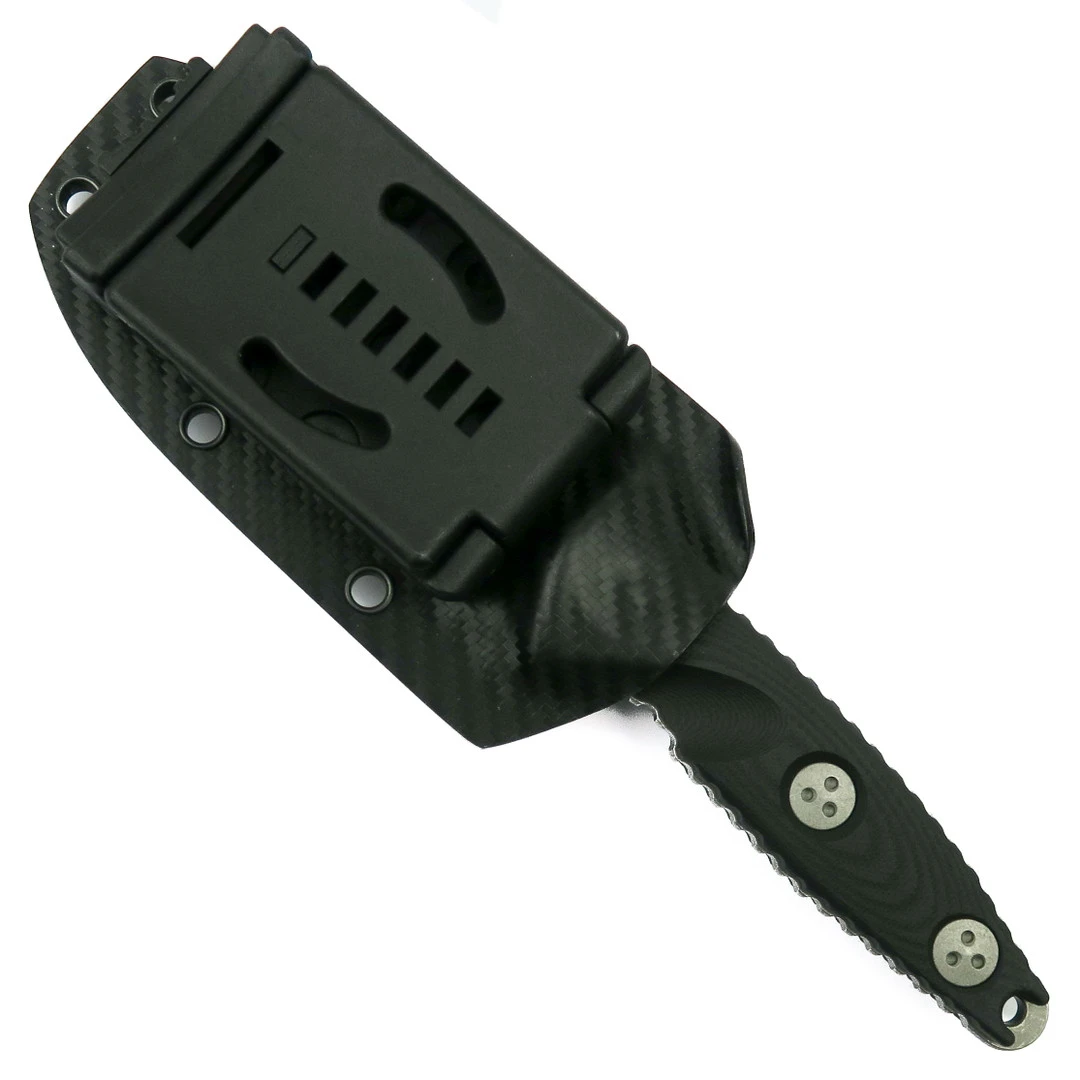 This Microtech Scoom Alpha MIni fixed blade knife features black G-10 handles, a clip point style blade with an apocalyptic stonewash finish and includes a custom kydex sheath.