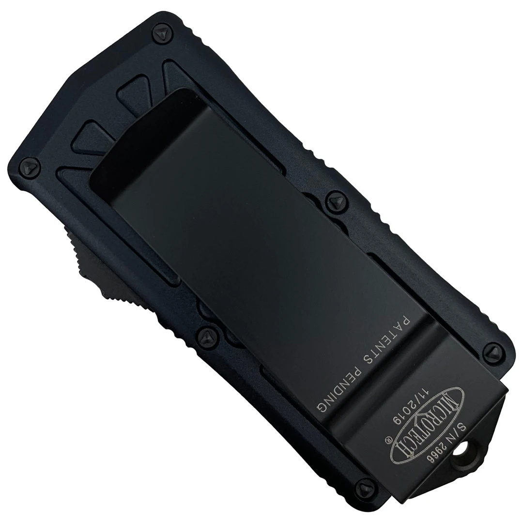 This Microtech Exocet out-the-front knife features a black anodized handle, all-black hardware and a dagger style blade in a black and satin finish.
