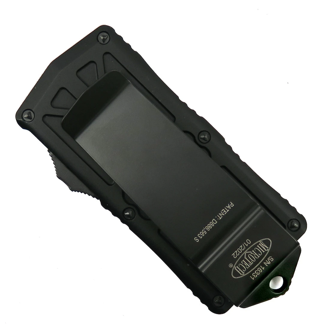 This Microtech Exocet out-the-front knife features a black anodized handle and a dagger style blade in a black and satin flats. All the hardware on this variation Exocet is black. The blade has one fully serrated edge and one standard edge– which makes it ideal for multiple applications.