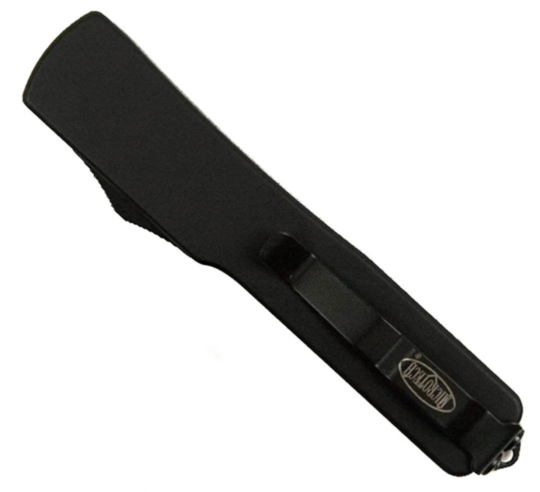The Microtech out the front UTX70 knife is the most compact double action knife available. The UTX70 OTF fires in and out (double action) when you slide the firing button up and down. Model MT149-1T has a single plain edged tanto blade with a black finish and all black hardware. The handle is black anodized 6061 T6 aluminum.