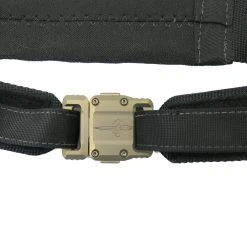 The Microtech Titanium Apis Titanium Belt Buckle with a Black Tactical Nylon belt features a nylon belt and a special machined titanium Apis belt buckle