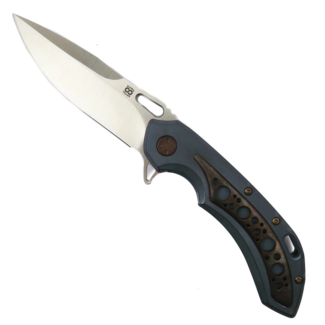 The Olamic Cutlery Wayfarer 247 features a satin Bohler M390 Drop Point style blade with a full flat grind.