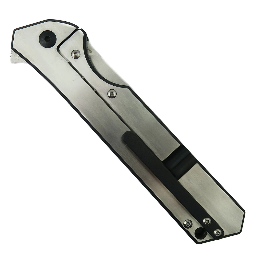 The Titanium handles and torx screws have a satin finish, the handles are styled with five accent holes with black coated chamfers. The pocket clip and hardware are all black coated giving an excellent contrast to the satin handles and back spacer.
