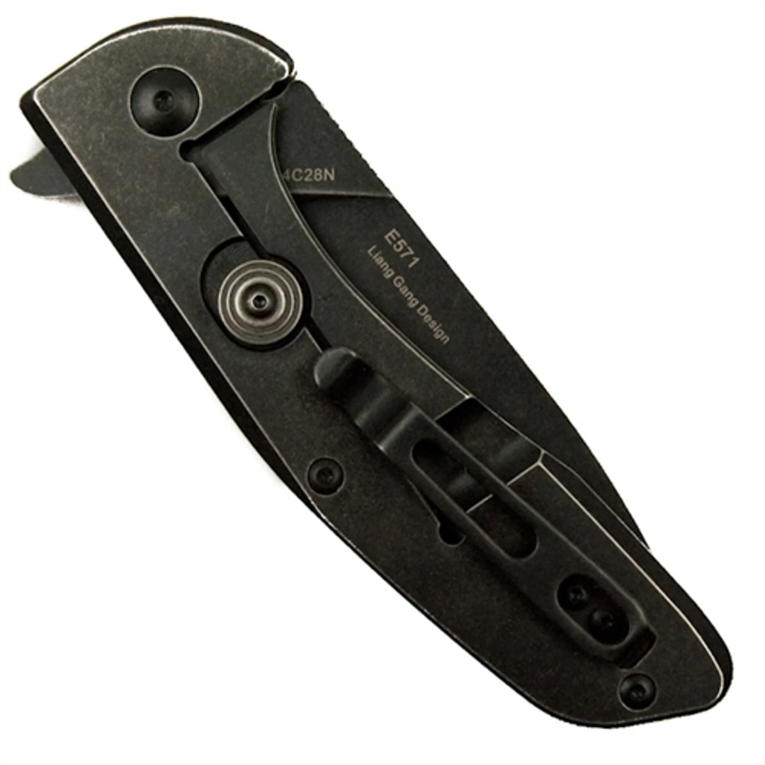 E571 is the first all-steel EDC-Flipper that is released by Real steel. The blade is 86mm/3,38’ long and 3,05 mm/0,12’ thick with full flat grind applied. RSK’s favorite steel 14C28N, HRC58-60 with good sharpness, edge retention and corrosion resistance was used as blade material. 3Cr13 material was used for the handle, due to special weight reduction treatment of the inside part of the handle, it became very light. The weight of E571 is about 112g/3,95 OZ, which makes it one of the lightest knives in its size class. There are two variants of surface treatment – stonewash version for everyday use and all black one for tactical use. E571 features a clip and a built-in lanyard hole.If you want a EDC flipper with the high quality 14C28N steel, ball bearing system, frame lock with “Beta plus”, CNC processing and RSK quality assurance, E571 then means the new standard at this class.