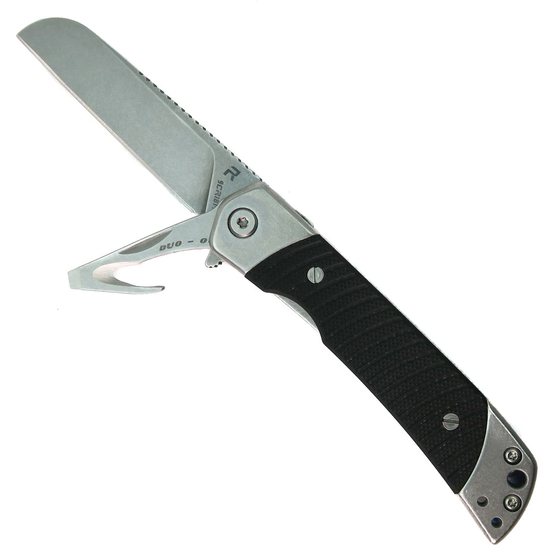 The REVO Duo Black Sheepsfoot Frame Lock Knife is a handy, lightweight knife. The rescue hook/seatbelt cutter with a slotted drive gives this knife double the abilities while retaining the traditional knife form. The sheepsfoot style blade of this knife is made of 9Cr18MoV stainless steel with a stonewash finish. This steel provides durability and excellent corrosion resistance. The milled G10 handle scales are comfortable, providing a solid grip. This knife boasts a striking blue backspacer. The main blade opens smoothly with a flipper tab, while the rescue hook tool opens by nail nick. This capable knife is a fantastic everyday carry.Â
