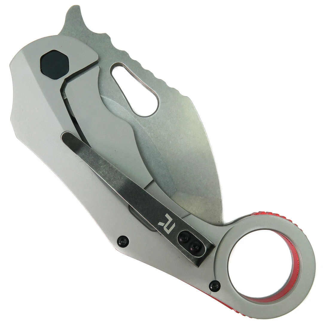 The REVO Gray K9 Karambit Knife is a slim, tactical style knife. This knife boasts a blade made of 9Cr stainless steel with an attractive stonewash finish. The stonewashed stainless steel handle scales provide a sure grip as the spine curves to comfortably sit in your hand. The thumb hole at the tail of the spine adds additional grip and control while the red backspacer, black hardware, and jimping add that extra flare you look for in a knife. The K-9 Karambit is your perfect everyday companion.Â