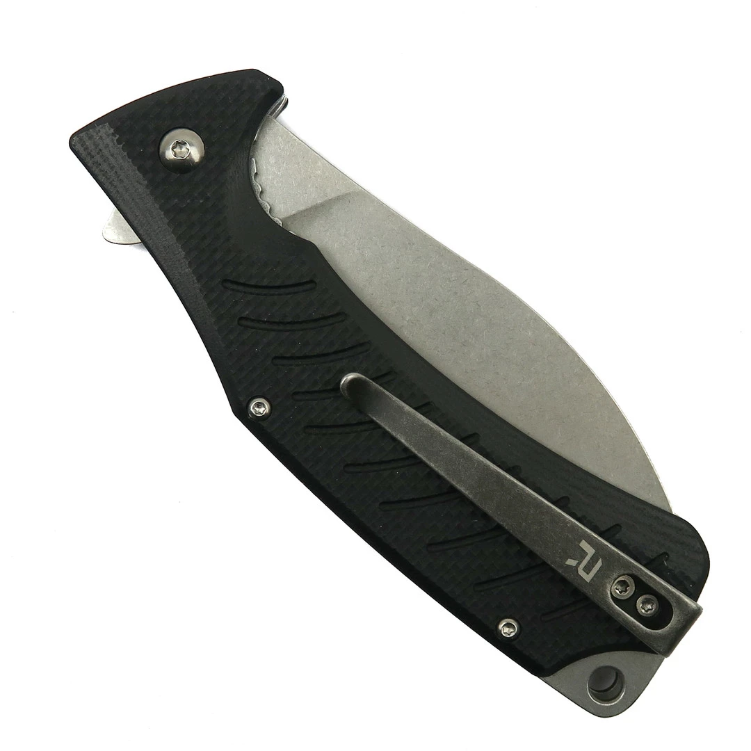 The REVO Ness Liner Lock Black G-10 Flipper Knife is a modern, versatile knife. This knife is an all-around performer that offers an update to the classic Nessmuk blade style. With a curved edge and a flat grind highlight, this knife provides excellent cutting performance. This knife boasts textured G10 handle scales which provide a great grip, backed up by stainless steel liners. With a stainless steel pocket clip and a lanyard hole, this knife is a convenient survival knife to take with you just about anywhere. This comfortable knife is a great addition to your everyday carry.Â