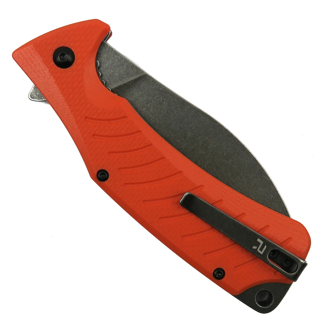The REVO Orange Ness REV 2 Flipper Knife is a modern, versatile knife. This knife is an all-around performer that offers an update to the classic Nessmuk blade style. With a curved edge and a flat grind highlight, this knife provides excellent cutting performance. This knife boasts textured orange G-10 handle scales which provide a great grip, backed up by stainless steel liners. With a stainless steel pocket clip and a lanyard hole, this knife is a convenient survival knife to take with you just about anywhere. This comfortable knife is a great addition to your everyday carry.