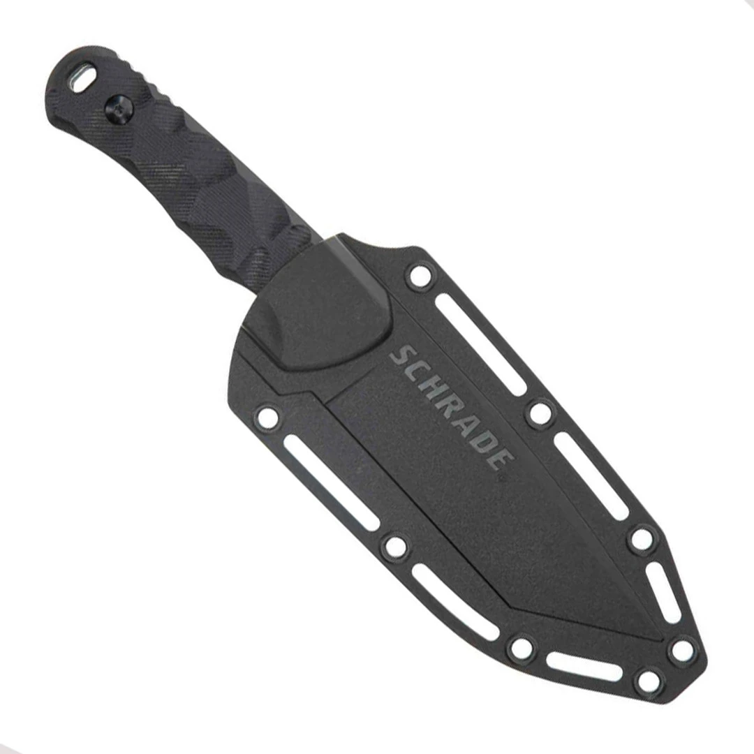 The Schrade Black G10 Regime Tanto Fixed Blade Knife features a tough tanto blade.This tactical fixed blade knife is made from hard-working material that all but does the job for you. The handle is made of black G10 and is shaped for comfortable hard use. The blade is made of AUS-8 stainless steel with a powder coated finish. This knife includes a polymer sheath with a carrying clip. This blade is a great addition to any collection.